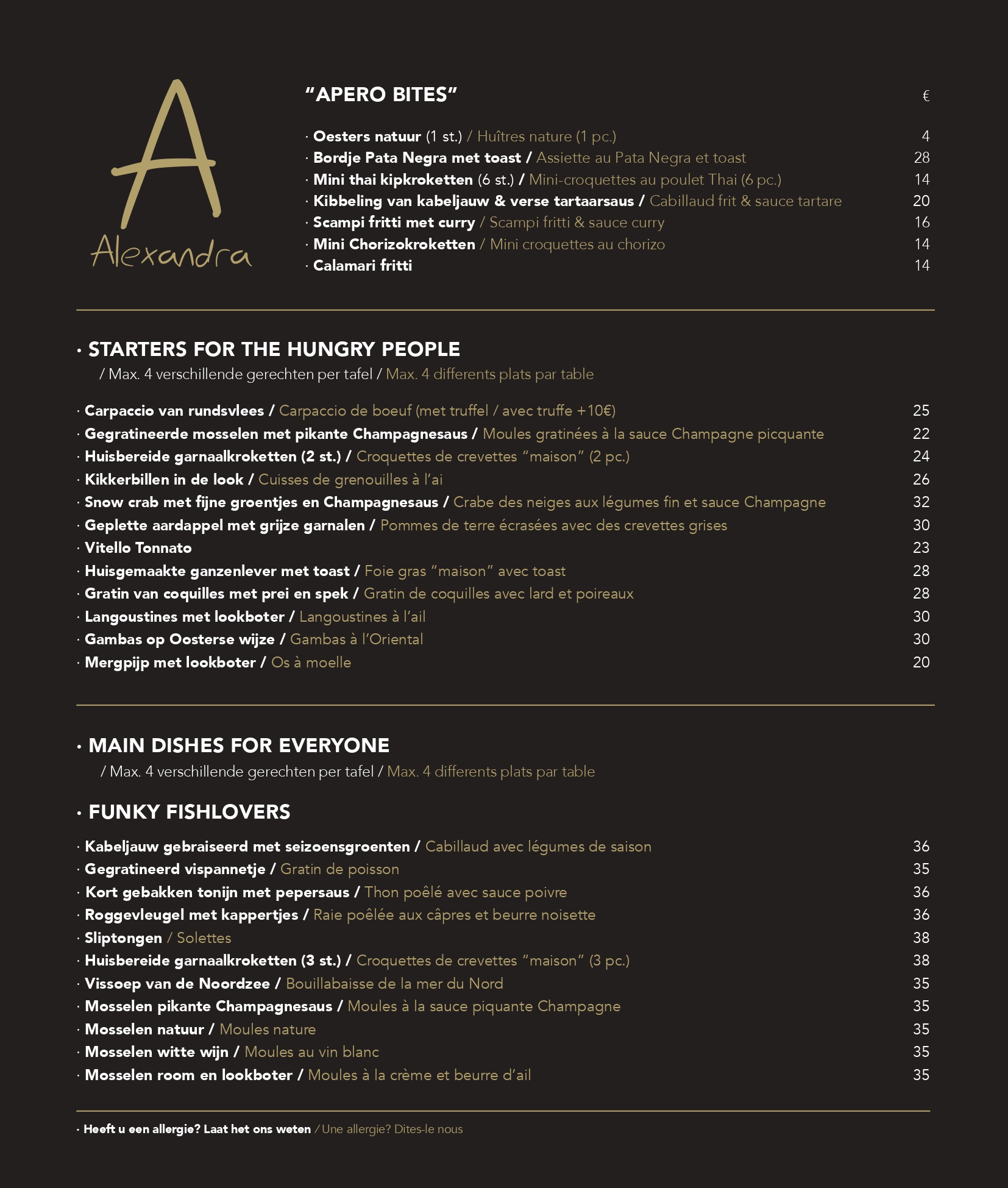 Op het Van Bunnenplein in Knokke weet restaurant Alexandra al jaren een trouwe schare lekkerbekken te bekoren. In een sfeervol interieur proeft u hier immers van het beste dat de zee te bieden heeft. Naast de vele gerechten op de kaart, kunt u eveneens genieten van onze seizoensgebonden suggesties of misschien opteert u voor één van onze specialiteiten: Noordzeetafel of huisgemaakte garnaalkroketjes. Bovendien worden alle gerechten geserveerd met handgesneden frietjes! Redenen genoeg dus, om hier zeker een bezoekje te brengen!